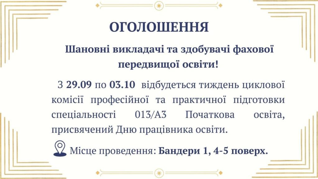 30 вересня у ауд. 403 (вул. Бандери, 1) на педагогічному відділенні відбувся методичний семінар-практикум на тему «Історичний розвиток української педагогіки», який об’єднав досвідчених викладачів, науковців та молодих педагогів. Учасники заходу мали змогу зануритися в історичні витоки становлення української освіти Читати далі